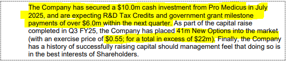 - June QTR Cash flow report: Revenue $0 | OCF -$3.5M | Cash on hand: $13.7M | No debt